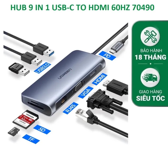Ugreen 70490 9 IN-1: Tận dụng tối đa tiềm năng của các thiết bị của bạn với Bộ Chuyển Đổi Hub Loại C của Ugreen. Bộ chuyển đổi này giúp bạn mở rộng máy tính hoặc điện thoại thông minh của bạn ngay lập tức với đa dạng cổng kết nối. Nó bao gồm đầu ra video 4K HDMI, VGA, 3 cổng USB 3.0, cổng RJ45 Ethernet Gigabit, khe đọc thẻ SD / Micro SD, và hỗ trợ sạc nhanh tốc độ cao thông qua phân phối điện Thunderbolt 3. Đáp ứng mọi nhu cầu của bạn một cách tuyệt vời.